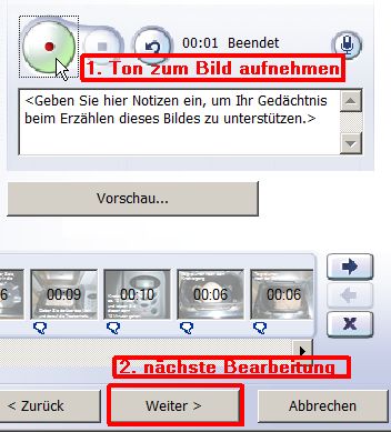 "Weiter >" bis der Effekt "Ton zum Bild aufnehmen" angezeigt wird. Sie können jetzt einen Audiotext hinzufügen. Beachten Sie, dass an Ihrem PC ein Mikrofon angeschlossen und aktiviert ist.