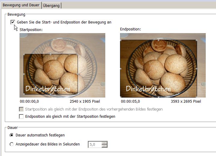 Klicken Sie auf "Bewegung anpassen" unter dem aktiven Bild, können Sie festlegen, welcher Ausschnitt zu Beginn und zum Schluss der Anzeige eingeblendet werden soll.