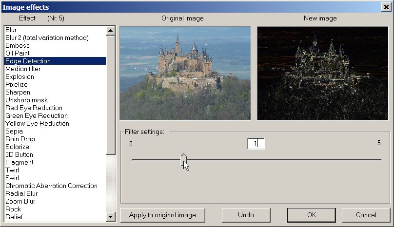 Wählen Sie über das Menü "Bild-> Effekte-> Einstellungen/Vorschau-> Edge Detection" und wählen Sie eine passende Einstellung durch experimentieren.