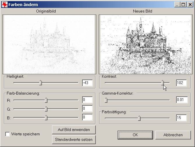 Im Menü: "Bild->Farben ändern" stellen Sie den Kontrast auf 100% und korrigieren Sie die Helligkeit nach Ihren Vorstellungen.