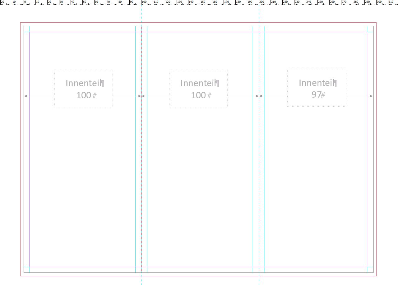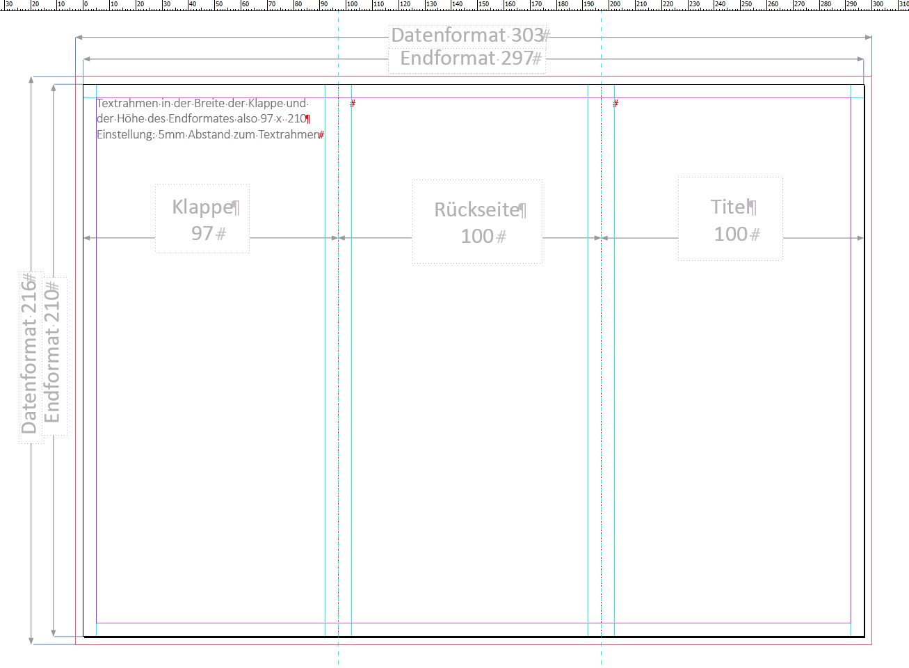 - Maße der Beschnittzugabe (Vorgabe der Druckerei für Innenseiten und Umschlag)
