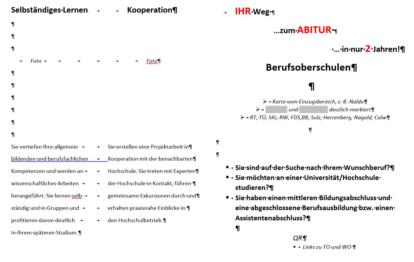 - Typografische Zeichen wie Absätze, Tabulatoren, Leerzeichen, manuelle Zeilenumbrüche dürfen nicht als Gestaltungsmittel missbraucht werden. Jedes dieser Zeichen darf an keiner Stelle mehr als einmal eingesetzt werden. Beispiel: Soll im Text nach einem Absatz ein größerer Abstand erscheinen, so ist dieser über Anpassung in der Formatvorlage erlaubt aber nicht durch das Einfügen eines weiteren leeren Absatzzeichens. Spalten dürfen weder durch Tabulatoren noch durch Tabellen dargestellt werden. Dafür gibt es in den Textprogrammen die Funktion "mehrspaltiger Text" und die Funktion "Spaltenumbruch".