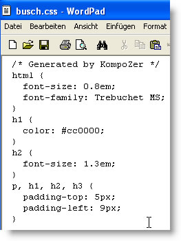 Bevor Sie die Änderungen, die Sie mit WordPad eingeben in der CSS-Ansicht des KompoZers sehen können, müssen Sie diesen einmal komplett schließen und wieder öffen.
