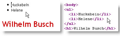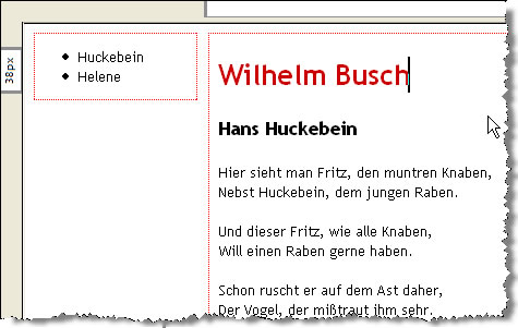 Positionieren Sie auf Ihrer Seite die Menüeintreige für die beiden geplanten Geschichten von Wilhelm Busch "Huckebein" und "Helene" für die Unterseiten als Liste über dem ersten Text.